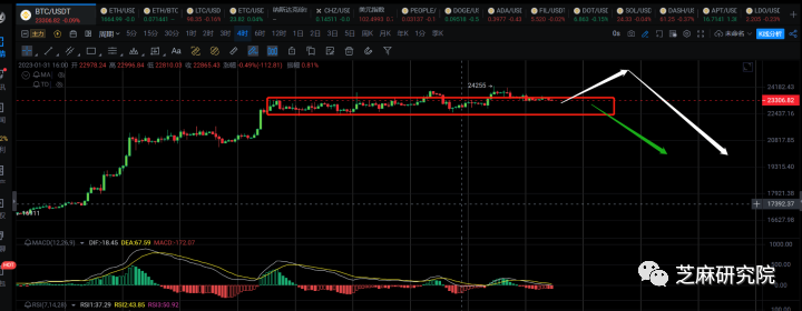 而要判断是否是真正的回调,就需要价格有效跌破22300这个位置,否则我们无法排除上面白色箭头的那种走势。