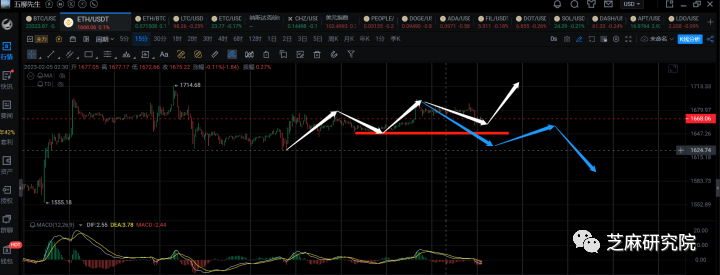 以太昨天已经走出1h级别的反弹了,当前这里是一笔15分钟级别回调,如果回调不跌破1644,那么可以构建一个15分钟的中枢,然后继续延伸1h级别的反弹。如果跌破1644,需要注意这里可能是在运行1h级别的下跌了。下方支撑1644,1600。