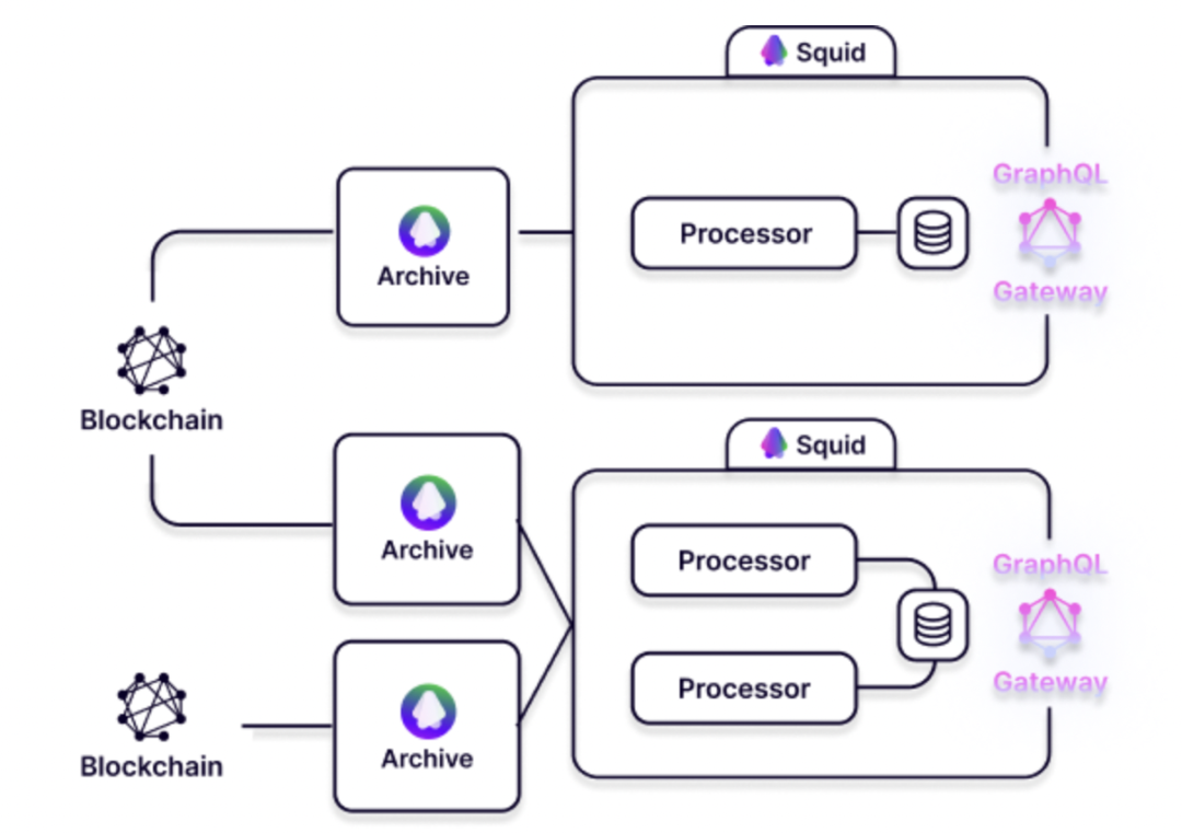 上图描述了 Subsquid 的两种节点,Archive 从底层状态机(blockchain)中摄取原始数据,保存到数据库中,而Squid 对数据进行分类并支持后续的 API(如GraphQL Gateway)进行查询。