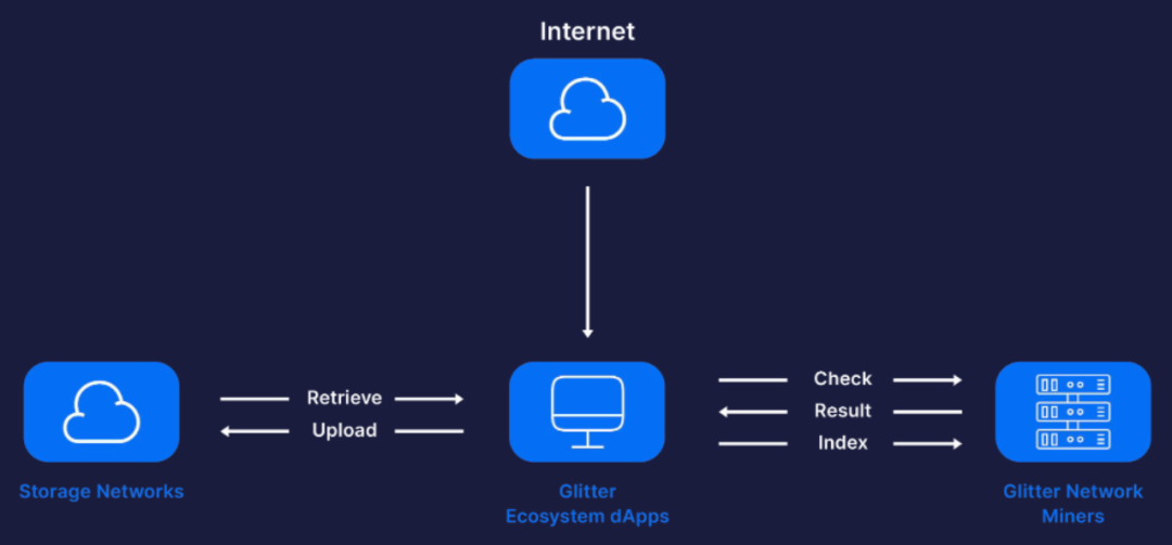 该图描述了 Glitter 的运作模式,Glitter 生态的去中心化APP负责上传和接收储存网络上的数据,并把任务分发给 Glitter 网络矿工们,并接收他们对数据进行检查和索引的结果。而外界可以通过该中心化APP访问到最终的索引结果。