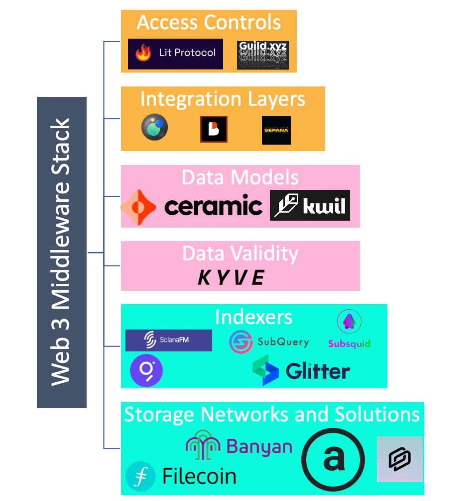 上图自上而下地逐层汇总了 Web 3 中间件应用栈的各级应用,访问控制有 Lit Protocol和Guild.xyz, 集成平台有 Polywrap,Gasless, 和Sepana,数据模型有 Ceramic,Kwil,数据有效性有 KYVE,索引器有 SolanaFM,SubQuery,Glitter,Subsquid等,储存网络及解决方案有Filecoin,Banyan,Arweave,Spheron。