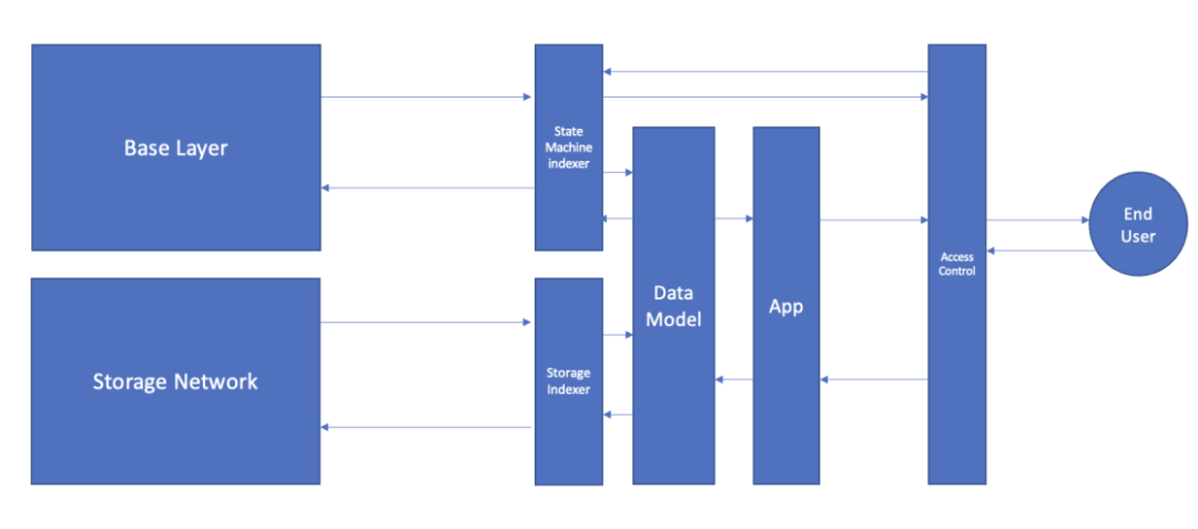 上图描述了中间件栈所构成的社交网络的工作流,基础层的数据通过状态机索引器发送到数据模型,平台的所有数据储存在储存网络上,并建立储存索引,这些索引的数据模型由 APP 调用,而访问控制层负责在向终端用户展示平台前检查用户是否有权访问。集成平台则可能包含在应用层中。