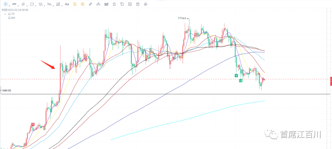 而且昨天有一个关键的地方就是,昨天破低点的下跌是BUSD的突发利空,但以太坊还是守住了自己1449的价格没有跌破,所以大饼虽然被连带跌破上周低点但没有进一步下挫并且很快收回。目前为止以太的所有折腾都在这根阳线起涨点上方。