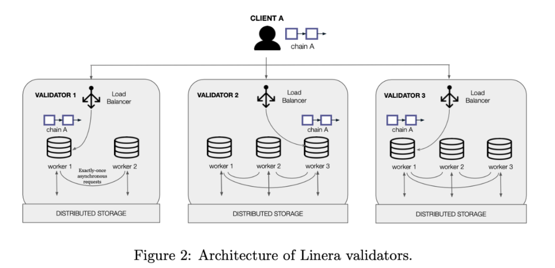 - 验证者可以创建多个Worker机器,将不同的微链集交给不同Worker处理。客户端与每个验证者的负载均衡器通信,验证器在内部将查询分派给适当的工作者。