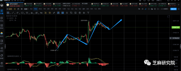这里应该还有一笔15分钟级别的反弹再冲一波,22300~22500区间是比较重的压力,估计这个区间要被挡住,然后走一笔1h级别的回调。