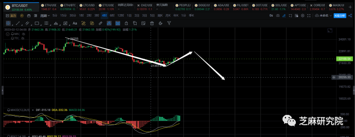 然后昨晚价格也突破了22200,所以4h级别的反弹概率就会比较大,这个我在内部群里也有说明。