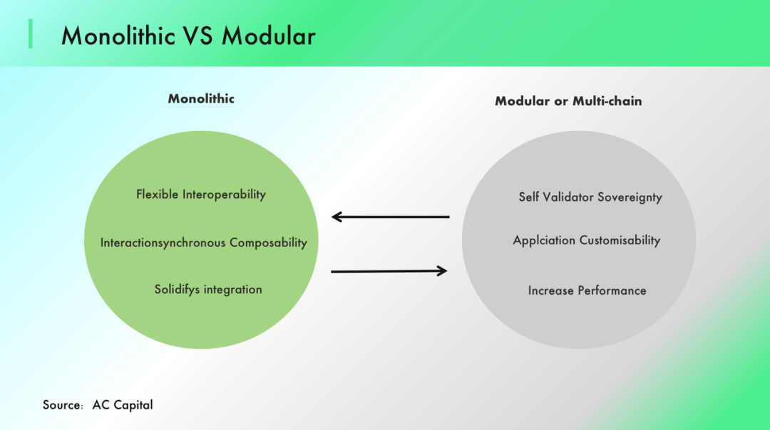 在过去Layer 1浪潮,如何提升网络性能是投资者始终热衷于讨论的话题。2022年9月,以太坊成功的完成合并,领导者Vitalik也表示以太坊未来将会以Danksharding的方式完成网络分片与扩容。尽管主网仍然同时保持着共识、执行、DA的功能,在交易基数增加的背景下,去中心化网络对计算资源的需求愈发迫切,以太坊正在通过扩容+Rolls Up 从单片结构向模块化靠拢。从Macro的角度来看,单片与模块更像是一个选择,而不是一个问题。当生态发展处于早期阶段时,计算资源并不会成为遏制发展的主要因素,用户与开发者更需要交互良好的使用体验,从这个角度,单片网络更适合那些处于早期的创业者与对依赖交互的堆栈化协议。相比之下,模块化公链更适合那些对计算资源有较高要求,同时具备广泛忠实用户群体的单体应用。