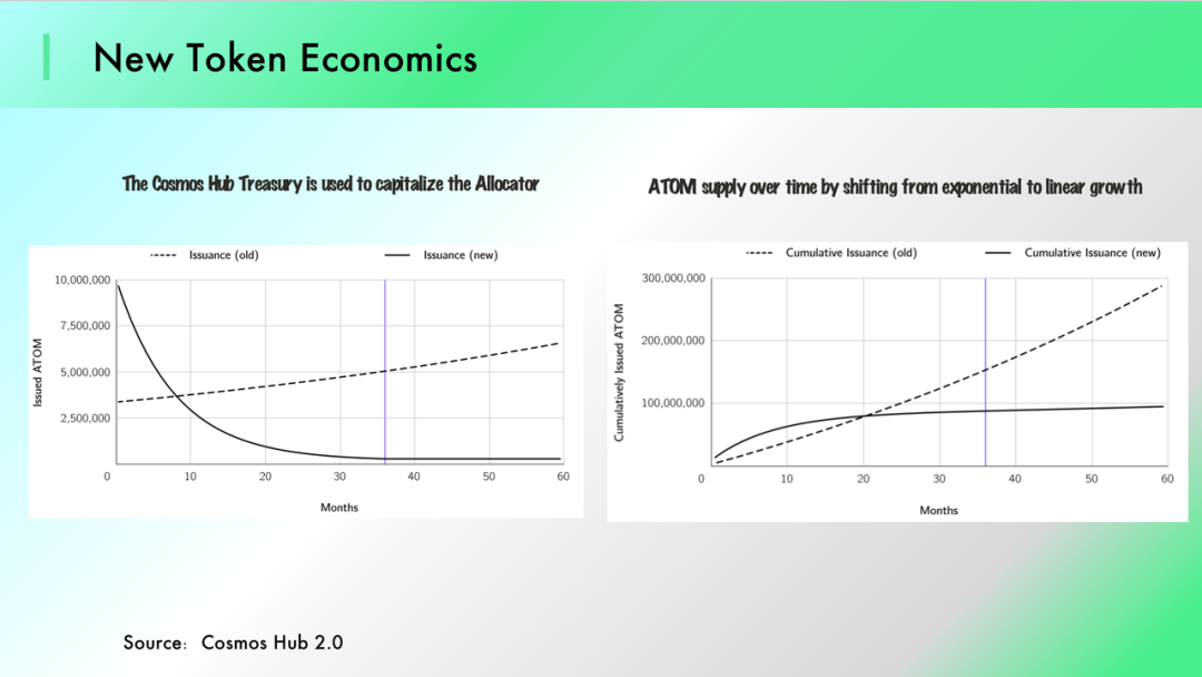 货币总量减少:社区有机会发展必要的社会基础设施,以有效管理庞大的资金库。过渡阶段从 Cosmos 转向新货币政策的那一刻开始,并在 36 个月后结束,此时稳态阶段开始并无限期持续。拟议的新发行模型将从指数增长转变为线性增长。从货币总量来看,ATOM 总供应量相较于原有模型显著降低。