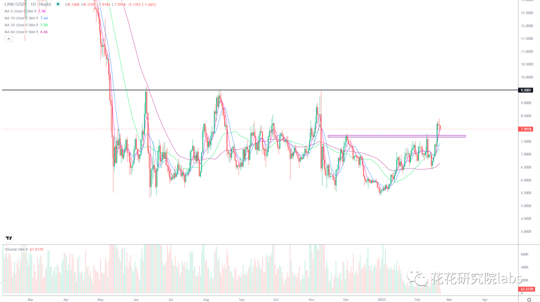 link突破压力并回踩,这里回踩调整结束就要去冲9.5的压力位了,9.5如果被突破的话,那将会打开link的上涨空间。