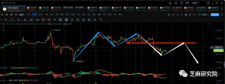 以太目前相对于大饼偏弱一些,今天的反弹都没能突破1720。目前这里有可能运行一笔1h级别的回调,现在还是第一笔15分钟级别的下,除非第二笔15分钟级别的反弹能够再次突破1695,那才认为继续走1h反弹的延伸,否则继续关注1620~1650附近的支撑情况。