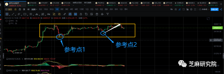 1h级别,昨天到今天的这笔1h级别的反弹,目前还是没有走出1h级别的中枢内,短暂插针刚刚到25250,那后续还是有机会继续寻找机会突破的。当前正在走一笔15分钟级别的回调,但是否走1h级别的回调还需观察力度,如果跌破24200,那大概走1h级别的回调。回调的支撑可以参考上图的两个参考点。参考点2是昨天回调的低点23840,如果再次回调到这附近企稳反弹的话,还是认为会比较强势的,有机会上涨的动力。如果回调到参考点1,即23339附近,那么行情会处于风险中。
