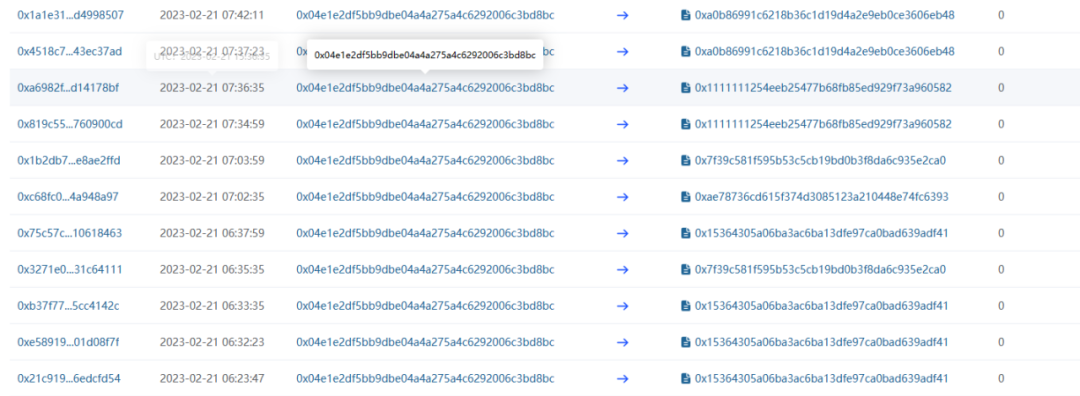 反制攻击发生于 2 月 21 日,当时sender地址(负责执行反制攻击,似乎归 Jump 所有)被添加为Oasis多重签名的签名者。Sender地址执行了五笔交易用于反制,随后从Oasis多重签名中删除。sender成为合格签名者的时间仅为 1 小时 53 分钟。
