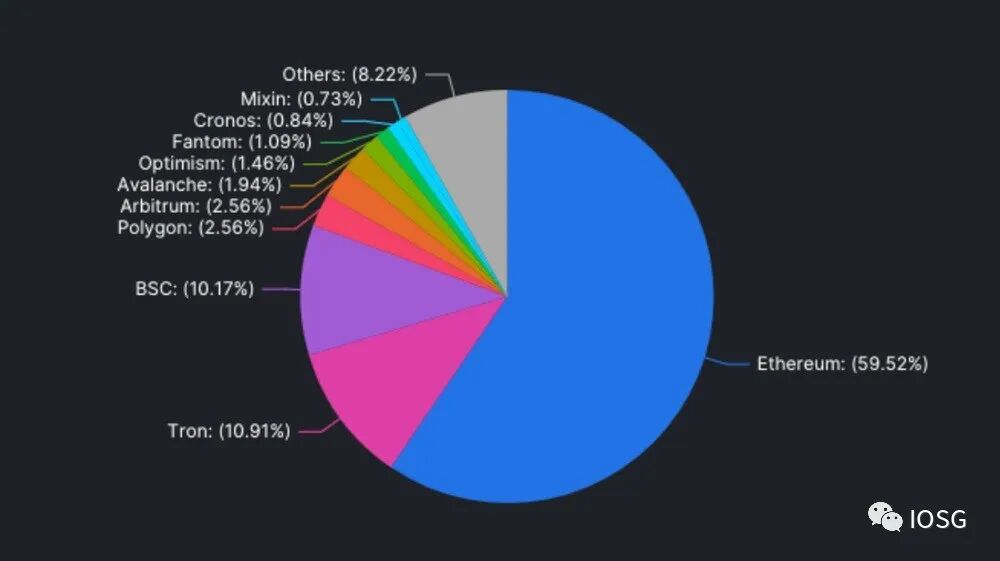 今天,各大链 TVL 饼图看起来是这样的。以太坊占据了大部分的流动性。Tron 和 BSC 占据第二和第三的位置。