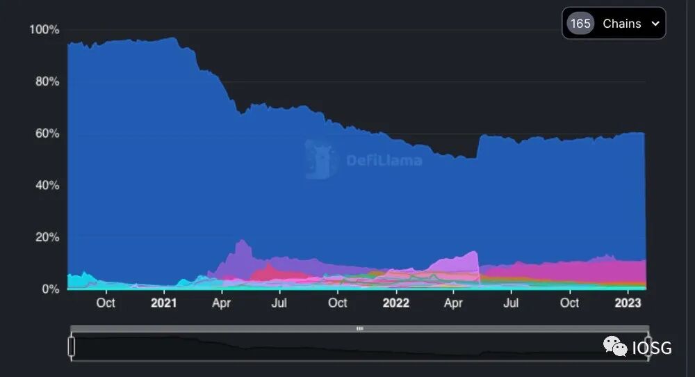 以太坊曾经拥有加密货币世界中除比特币之外的所有流动性。在 2020 年底,以太坊 TVL 占比急剧下降到 60% 左右。以下是 165 个链的 TVL 数据。
