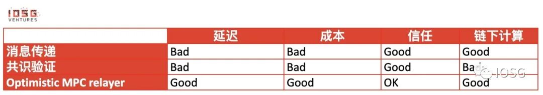 Optimistic MPC relayer 牺牲了一些信任,但获得了更低的延迟。用户只需要将交易发布到中继器网络。具体的延迟取决于具体的 optimistic MPC relayer 机制。挑战期可能会导致更大的延迟。用户需要对中继网络有最小的信任。这种方式没有大量的链外计算,但需要在中继网络中进行通信和欺诈证明。