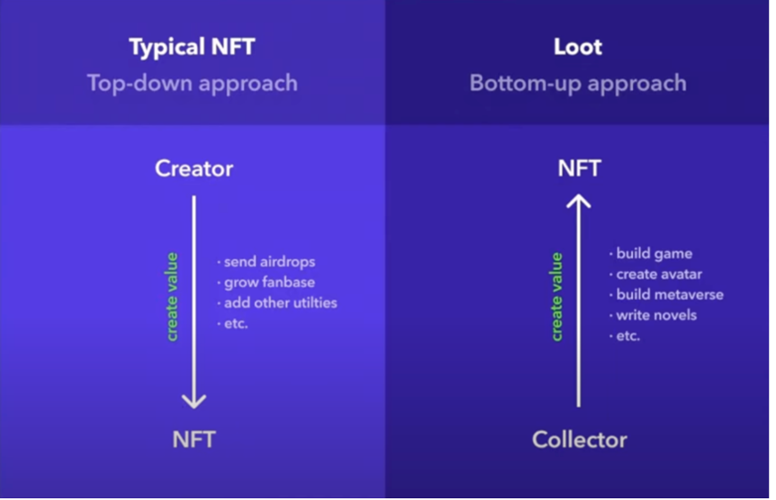观点二:游戏内经济系统甚至物品的设计产出应当交由玩家,即纯粹的去中心化市场经济模式。这种模式在 2021 年 9 月的 Loot 生态中得到实践并引发市场关注。不同于传统 Web3 游戏项目,创作者设计创作 NFT 卖给收藏者,Loot 收藏者也会参与到游戏生态的建设中。尽管 Loot 生态在后续的表现欠佳,但在 2023 年全链游戏进入视野时 Loot 又成为了人们的讨论话题。(有意思的是,2022 年底大火的 MAGIC 平台生态也是由 2021 年的 Loot 衍生出的项目)