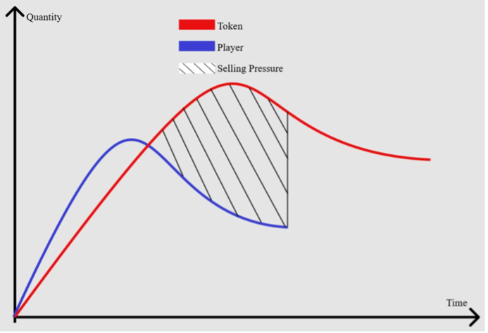 上图中 token 红色线的斜率代表了通货膨胀率,Player 蓝色线的斜率代表了用户增长率。项目方可以关注玩家数量的变化,重点关注玩家激增期间的动态调整,控制玩家的增长速度和货币供应量。货币过度超发是不可取的,随着玩家数量的增加,货币供应应该放缓。建议对游戏币总量实行固定分配制度,由官方制定每日或每月发放的代币总量,然后根据比例进行宏观调控,控制通胀率,使代币供应量的增长速度与用户增长率保持动态平衡从而延长游戏的寿命。因为一旦新玩家的数量跟不上货币供应量,就会迅速导致货币贬值,无处消费,从而引发加速退出的恶性死循环。