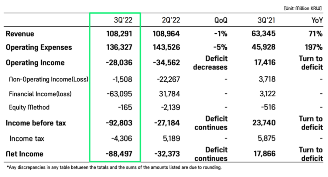 而在 Wemade 官网最新发布的三季度财报中,公司并未抑制住亏损的势头,并由于财务性收入上的损失,使得公司净收入亏损达到 884.97 亿韩元。