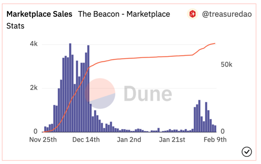 轻量级游戏发行平台 - 如 MAGIC(TreasureDAO)生态平台。此类平台会搭建多种小游戏生态,让平台 token 可以在各种小游戏之间流通使用。2022 年 11 月开始大火的 Beacon 游戏在短期内就为 Magic 生态平台带来巨大流量,同时也引发了人们对于 Magic 后续其他游戏产品的期待。