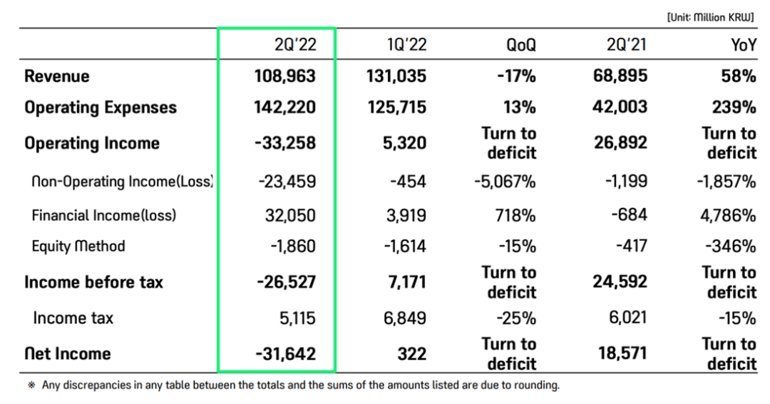 不可否认的是,从公司公布的财报来看,Mir4 确实带动了游戏收入的增加。Mir4 在 4Q21 净收入为 4247 亿韩元,约为 3.37 亿美金,由此 Wemade 经营情况有了大幅好转。但 Wemade 2021Q4 的净收入暴涨,很大程度来源于 Wemix 代币抛售,且此项收入目前看来并不具有连续性。因为在随后的 Wemade 1Q22、2Q22 财报中可以看出,公司 Web3 布局成本的增加并未持续给公司带来收入的提升。Wemade 在 2022 年一季度的净收入只有 3.22 亿韩元,甚至在二季度财报中,Wemade 合并营业亏损 332.58 亿韩元,净收入也进入亏损 316.42 亿韩元的状态。