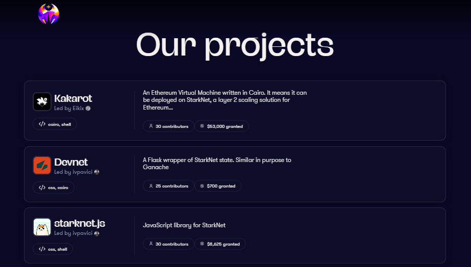 OnlyDust 是一个将开发者与 StarkNet 生态系统中的开源项目联系起来的平台。OnlyDust 使开发者能够帮助 Kakarot、DevNet 和 starkNet.js 等有意义的项目,并根据他们的贡献价值每周获得报酬。多亏了 Warp,Solidity 开发人员也可以参与其中。