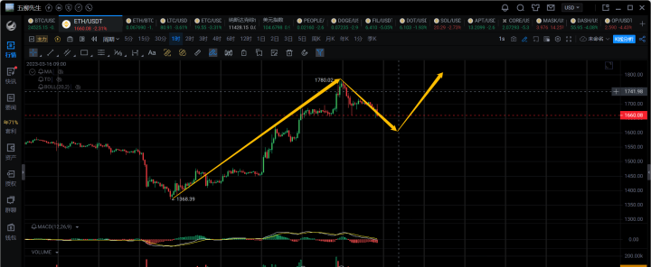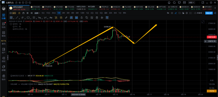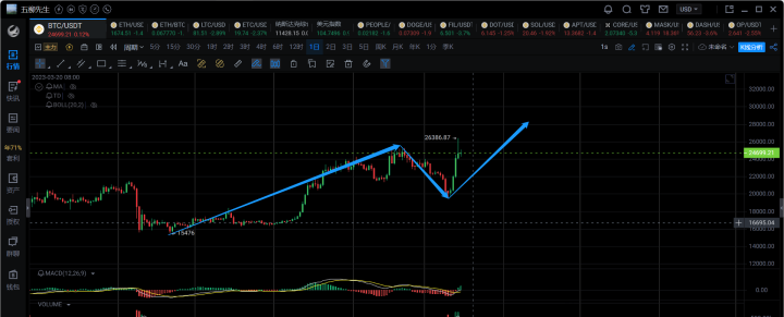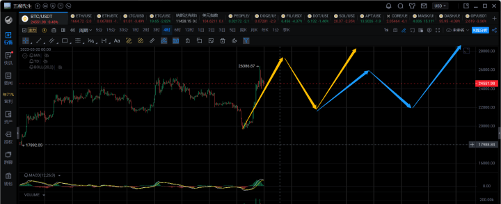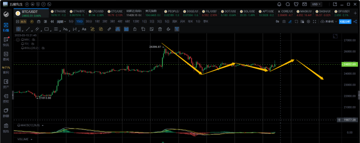 大饼这里4h级别的反弹还没有结束,还差一笔1h级别的反弹,希望后续能给出4h的顶背来对应4h级别反弹的结束。在不突破27500的情况下,我个人预估大饼还有一次深度回调的机会,比如回踩22000,甚至21000附近。因为短期这里拉的比较猛,但是持续性不算特别好,这次杀了空头,后续是否可能杀多头呢?