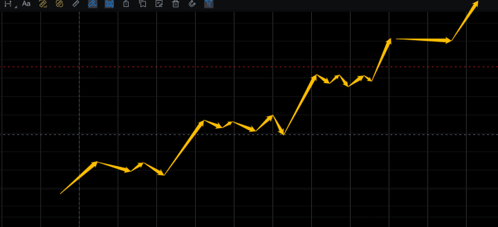 什么意思呢,大饼要想走的高,其结构必须要像上图这样,走出上阶梯的结构。每向上反弹一波,就在顶背维持震荡,小回调,然后继续上台阶。这,才是牛市的走势,否则,走的稀稀拉拉,搞了半个月,价格还是原地踏步走,就注定反弹不高了。