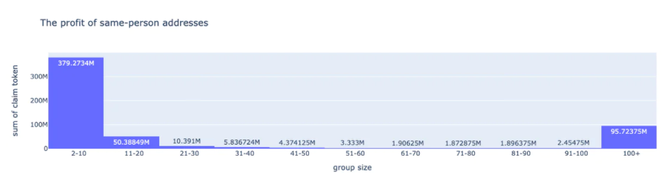 以下是同人地址组大小及其相应的可领取 token 的分布情况(单位:token)。