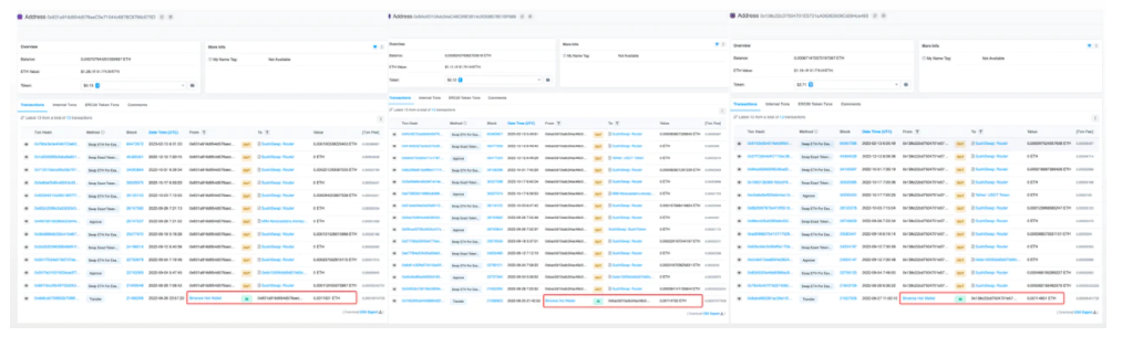 我们进一步取出了这些从 FTX 交易所提币的女巫地址。除了资金数量一致外,它们还有非常一致的智能合约调用。