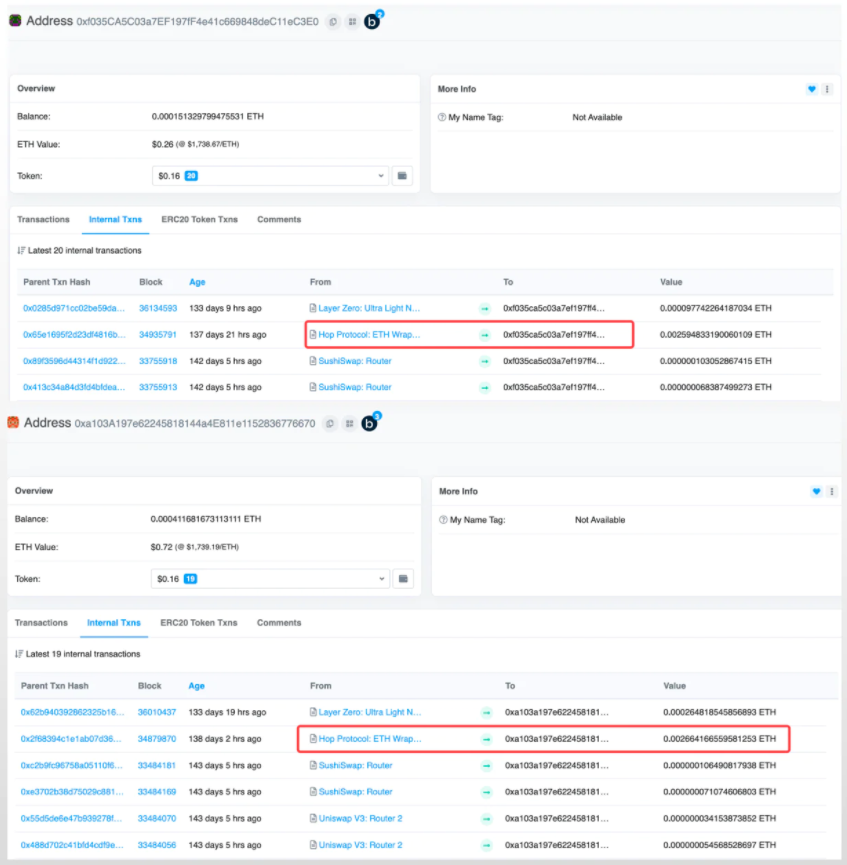 1. 在 2022 年 11 月 02 日至 11 月 07 日期间,共有 1114 个接收空投的地址通过 HOP 桥(0x33ceb27b39d2bb7d2e61f7564d3df29344020417)跨链到 Arbitrum。存款金额非常一致,这些地址总共收到了 108 万个 token 。