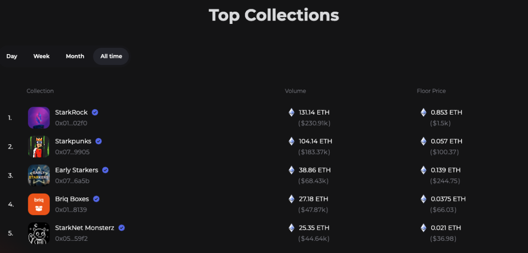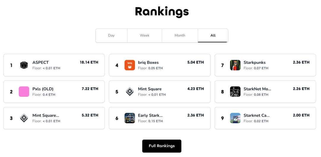 Aspect 是 StarkNet 生态中首个 NFT 交易平台,于 2022 年 8 月推出,用户可以在该平台上铸造、上传和买卖 NFT。目前其交易量仍然较小,处于早期阶段。