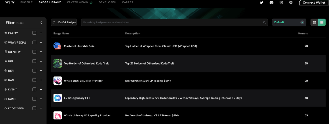 - 个人品牌打造:WIW 能够帮用户展示链上成就,打造链上简历,通过构建用户的链上信用来让用户获得潜在的空投和信用借贷机会