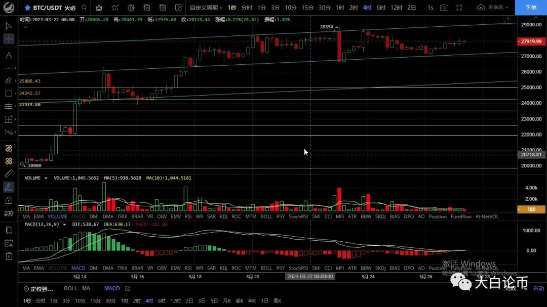 周末两天行情波动不大,昨日晚间有效突破27700短期阻力后连阳上行,最高触及28188一线迅速回落,恭喜跟上昨日思路的朋友,目前币价在27900附近运行,四小时级别盘面没什么太大变化,整体呈碎步上行,macd转为多头双线粘合,价格重新站上ma7上方,技术面虽看向多头但反弹力度偏弱,日线级别昨日收阳k且站在ma7均线上方,形成连阳走势,个人预计有再次触及高点的可能,若日线收在ma7下方则止损,短期思路建议回踩做多为主受阻后反手做空,上方压制28300-28800,下方支撑27600-27100