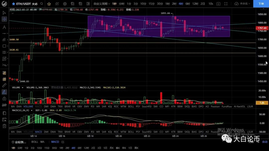 以太坊昨日再次试探下方关口支撑未破,整体走出震荡上行,下午多头发力加速拉升,经过短时间横盘后再次上行最高至1800一线承压回落,低位跌至1754一线,恭喜跟上昨日思路的朋友,目前币价在1764附近运行,四小时级别昨晚行情虽上攻但未能站稳迅速回落k线由阳转阴,随后几次试探1780都没有效突破,可见区间中继阻力依旧存在,短期走势没什么变化,依旧处于区间内震荡,多空反复macd双线粘合,日线依旧是阴阳交替运行,但昨日收线形成上影线,多头逐步完成缩量双线聚拢有形成死叉迹象,短期行情有回踩需求,整体走势依旧是震荡,未破位前思路保持不变高空低多对待,上方压制1780-1820,下方支撑1735-1710