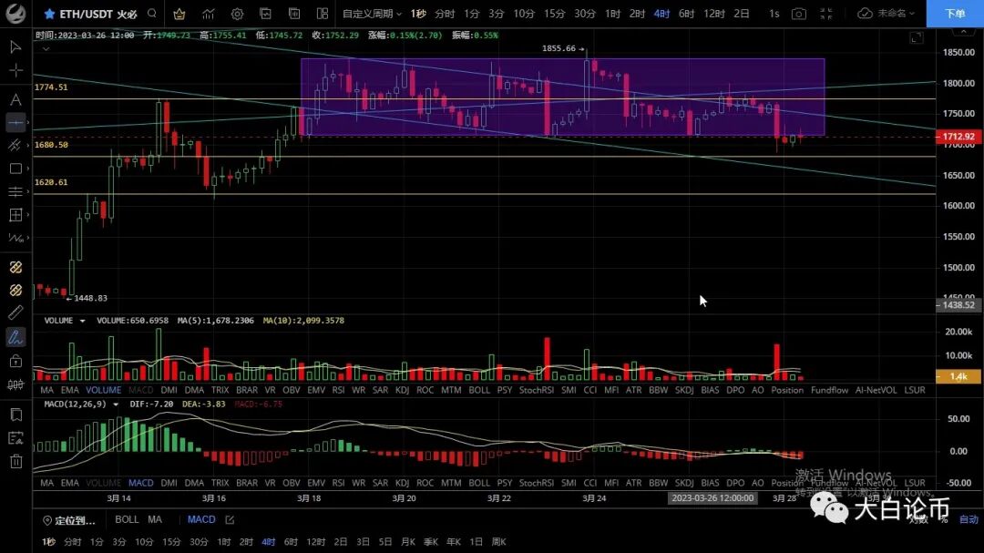以太坊昨日白盘触及1750附近支撑后走出一波反弹,但力度不大,随后空头发力加速下行,破位1700关口最低跌至1687一线支撑反弹,恭喜跟上昨日思路的朋友空单获利50点,目前币价在1710附近运行,四小时级别价格跌破箱体后两次测试都未能站稳,macd空头运行双线死叉,ma均线向下指引,整体走势较弱,若后续反弹站不稳箱体内则会继续下行,上方关注1735阻力区域站稳则延续多头走势,日线级别macd多头转空双线形成死叉,ma7和14有死叉迹象,技术面来看虽偏向空头,但k线实体未能有效跌破箱体,所以不能盲目追空,日内思路建议反弹高空为主低多为辅,上方压制1735-1760,下方支撑1680-1650