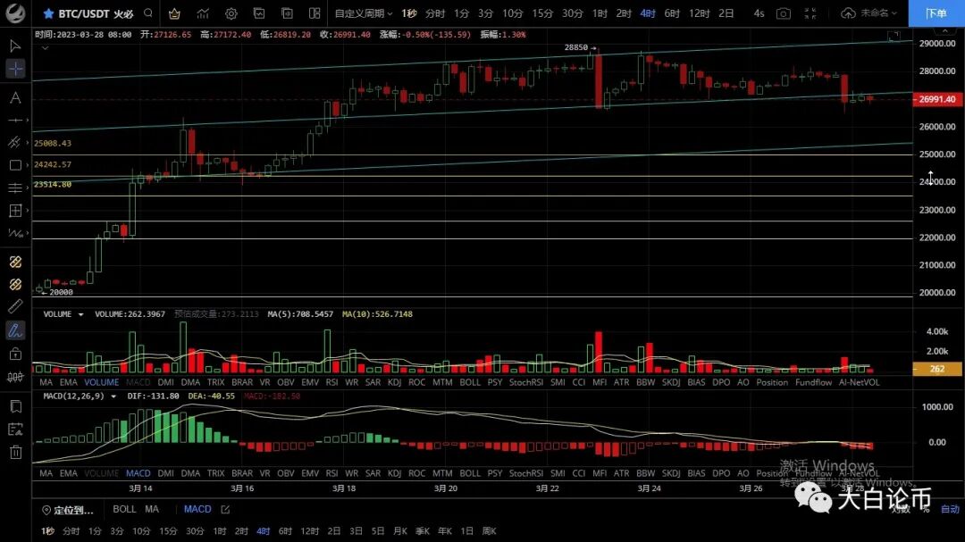 大饼昨日白盘波动不大,直到晚间行情连阴下挫加速下行,最低跌至26510一线支撑,最高反弹至 27312附近承压回落,目前币价在26980附近运行,四小时级别行情跌破通道支撑后转为压力,且多次试探都未能突破而回落,macd空头运行双线死叉向下,ma均线向下指引,但目前盘面处于大跌后修复阶段,整体呈震荡波动不大,技术面来看行情偏向空头,日线级别以下影线收盘,未能有效跌破26500多空分界,不可过分看空,整体来看行情缺少回调,技术指标偏向空头,若有效破位可以追空,日内思路建议反弹高空为主低多为辅,上方压制27300-27600,下方支撑26500-26000
