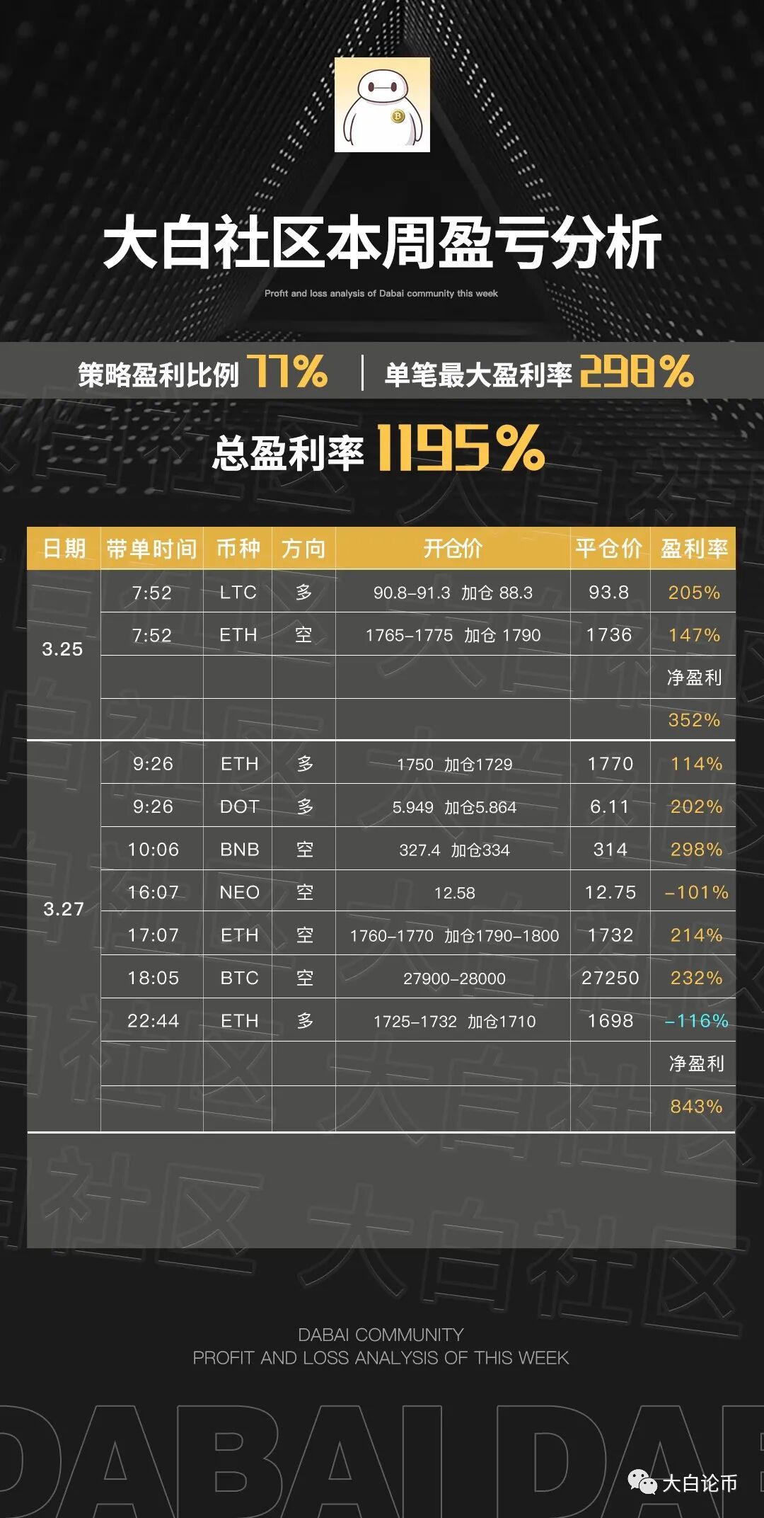 下方是大白社区本周实盘群单子,恭喜跟上的币友,如果你操作不顺,可以来试试水。