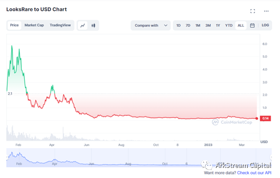 LooksRare后续的币价表现与交易量表现证明了交易挖矿的失败。