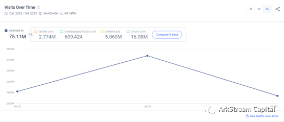 迫于Blur带来的竞争压力,OpenSea在2月22日开启了0手续费以对抗Blur,但是这并没有显著的提高OpenSea的交易量,更像是一个被动防守的策勒。
