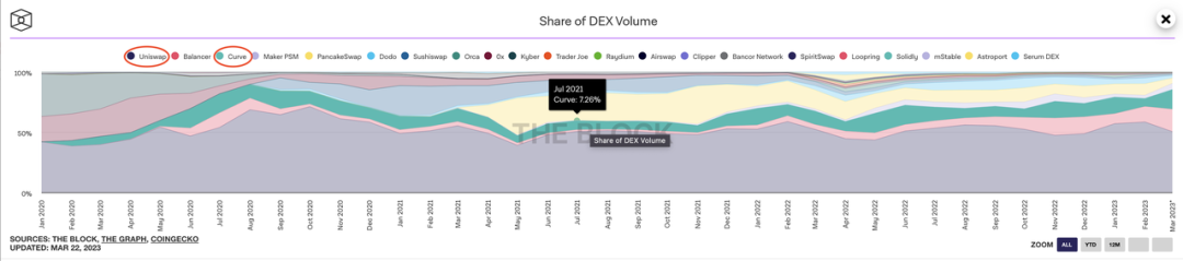 尽管 Uniswap V3 在推出后抢占了部分稳定币的交易量,但是 Curve V2 也开始吸引波动性资产的交易量,以扩大其用户群。目前在以太坊上,tricrypto2($USDT/$WBTC/$ETH) 是 Curve V2 目前最大的流动性池,最新的每日交易量已经达到$6600万。从市场上各个去中心化交易所的交易量占比来看,自从Uniswap V3和Curve V2上线以来,它们之间的差距没有明显变化。可以参考下方的图表。