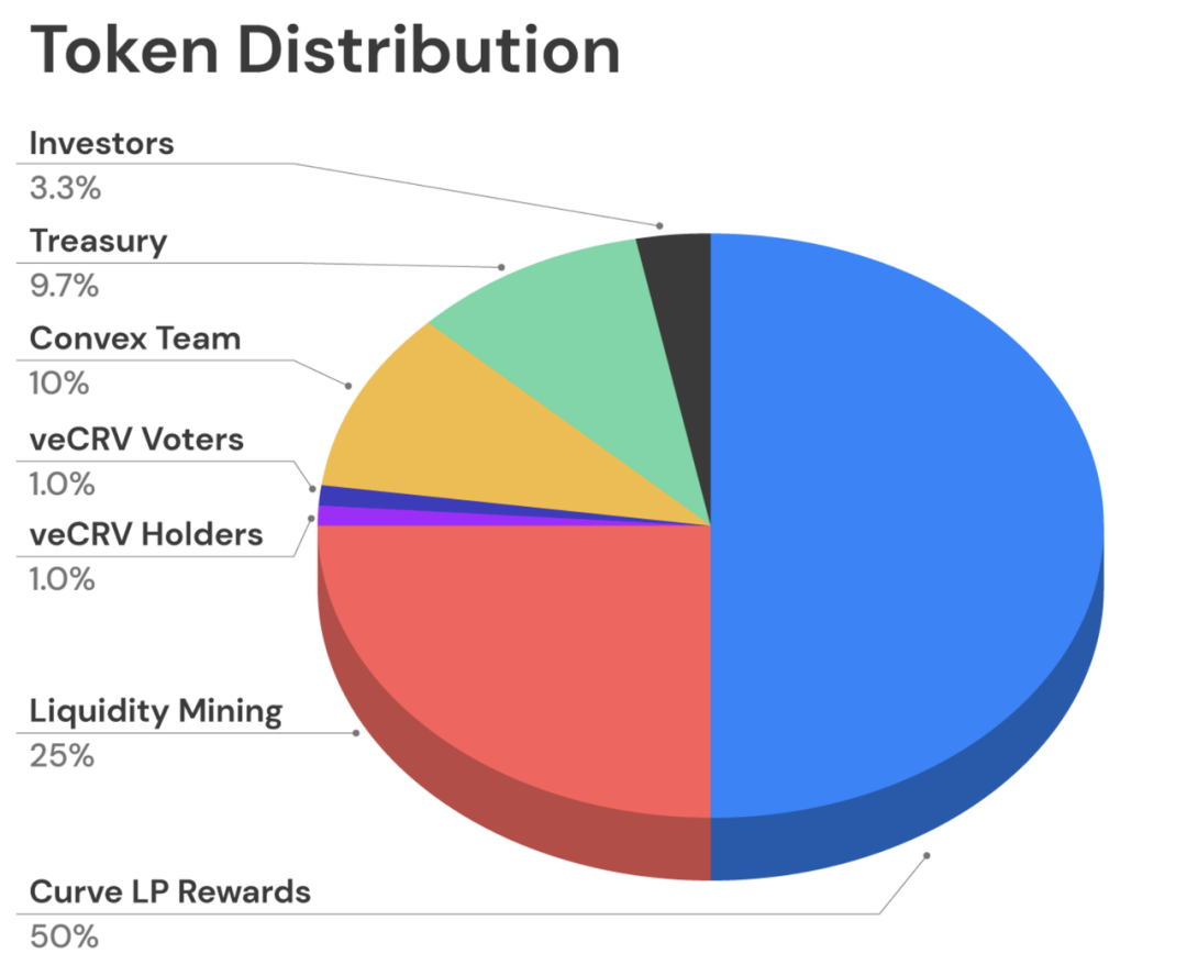 $CVX 的发行数量与 Convex 在 Curve 上赚取的$CRV数量挂钩。总供应量上限为 1 亿枚。10%留给 Convex 团队,3.3% 分配给投资者,剩余 86.7% 用于社区奖励。在治理机制上,Convex采用 veToken 投票机制,$CVX 持有者需锁定代币一段时间(至少 16 周)获得 $vlCVX,即治理投票权。Convex 协议由于拥有大量 $veCRV 代币并进入了 Curve 治理白名单,可以参与Curve 的投票程序并传递治理投票权给 $vlCVX 持有者。
