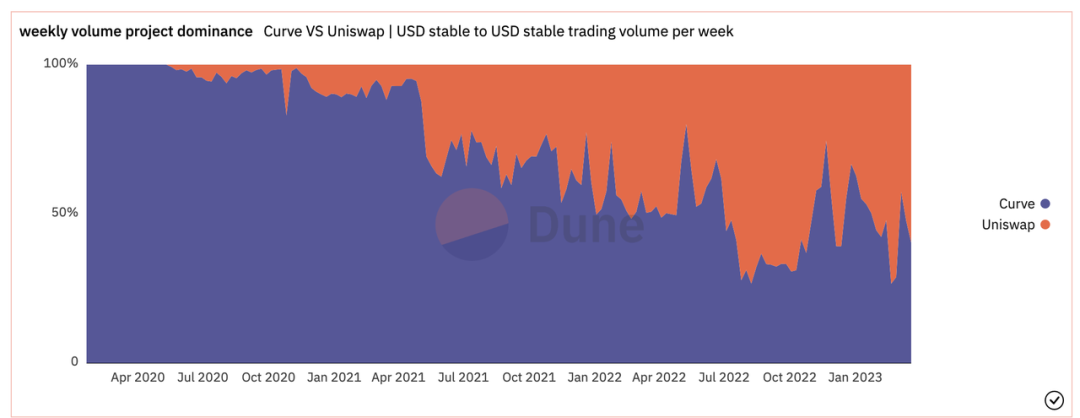 1. DeFi 竞争激烈:Curve 面临同质化与非同质化竞争对手挑战DEFI 领域内的竞争非常激烈,Curve 的业务收入增长遇到挑战,并且还存在着业务收入下滑的巨大风险。其中有来自业务同质化的竞争对手,通过技术创新来抢占业务收入。例如,2021 年 5 月 Uniswap 推出了协议的 V3 版本,采用集中流动性算法机制,提高了稳定币做市商的资金利用效率,降低了交易者的交易费率和滑点,从而威胁到了 Curve 在稳定币交易市场的份额。根据下图中 Curve 和 Uniswap 稳定币交易量的比较,可以看到自 Uniswap V3 推出后,相对于 Curve,Uniswap 在稳定币交易量的市场份额逐步提高。