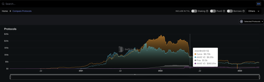 还有来自业务非同质化的竞争对手,通过扩展其产品和服务线,以吸引更广泛的用户,并确保其平台能够满足用户的不同需求,来争夺业务收入。例如借贷协议 Aave 计划推出自己的原生稳定币,稳定币发行商 Frax 推出了自己的交易和借贷平台,旨在扩展 DEFI 的全栈业务,以吸引更多用户的资金流入。观察下面的 TVL 趋势图,我们可以看出 Curve 曾经拥有显著的优势,但现在已被 Aave超过。此外,Curve 和 Frax 之间的差距也逐渐减小。图片来源:defillama.com