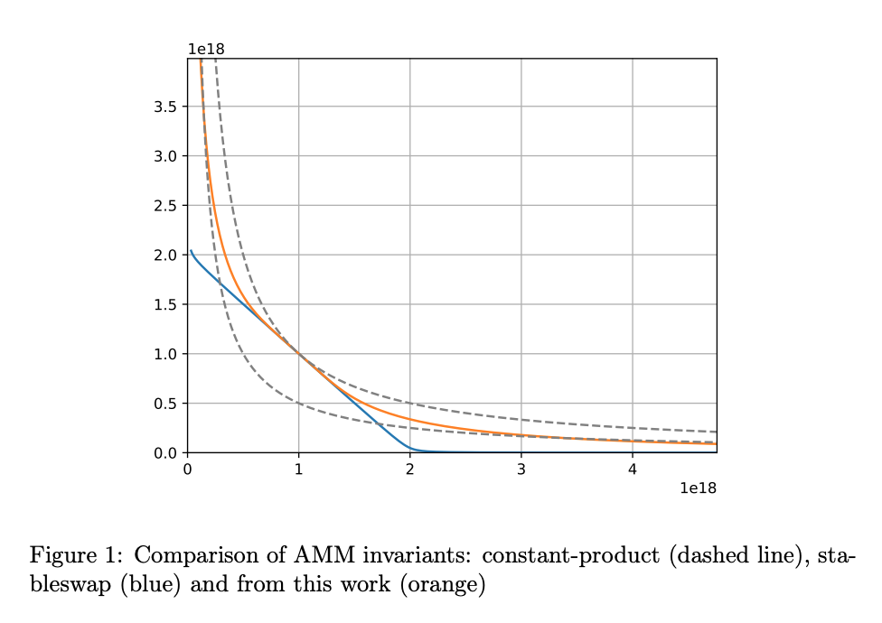 Curve V2 的曲线(橙线)位于恒定乘积曲线(虚线)和 Curve V1 曲线(蓝线)之间,曲线尾端逐渐向恒定乘积曲线收敛。这种改进使得 V2 不仅保留了 V1 曲线在平滑区域低滑点和高流动性的优势,而且克服了尾端流动性不足和价格变化响应滞后的问题。此外,V2 还独创了了内部预言机 EMA 机制以防止外部风险,提高流动性聚集度并降低无偿损失,同时 V2 曲线的动态属性也进一步提升了 Curve 的资本效率。