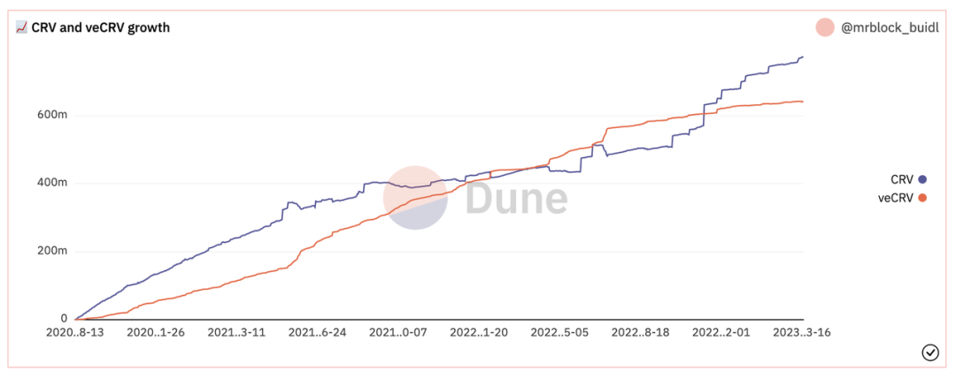 在验证 PMF、实现自然增长后,为了进一步推动协议的发展,Curve 于 2020 年 8 月推出了代币 $CRV,并引入了首创的 veToken 机制。“veToken” 全称为 “Voting Escrow Token”(“投票托管代币”),是一种投票治理机制,这种机制允许用户可以将协议代币锁定在一个称为 “Voting Lock Contract”(“投票锁定合约”)的智能合约中,以获得一定数量的 veToken,即协议的治理投票权。 veToken 机制旨在鼓励用户长期持有代币,促进参与者之间更大的激励一致性,从而改善代币的供需和为协议提供可持续的治理基础。|代币的发行和分配:持续的激励平衡,助推经济上的去中心化$CRV 的最大供应量为 30.3 亿枚。初始供应量 13 亿枚(占发行总量 43%)的分配方式包括:5% 给早期的流动性提供者,30%给团队和投资者,3%给雇员,5%用于社区储备。剩下的57% 将逐步释放作为未来流动性提供者的激励,未设线性解锁时限,直到达到发行上限。代币的释放周期较长,到 2026 年只释放总供应量的约 75%。