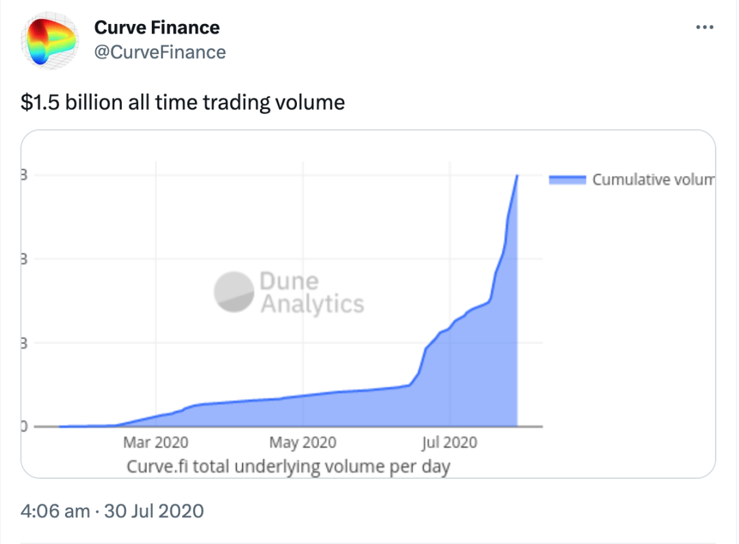 从上线到 2020 年 7 月 30 日的半年时间里, Curve 的使用用户累计 8000 多,累计交易量已达到 15 亿美元,上半年总交易量进入 DEX 前四名。这一成果验证了 Product-Market-Fit,为 Curve 平台的吸引力和收入稳步增长提供了坚实的基础。