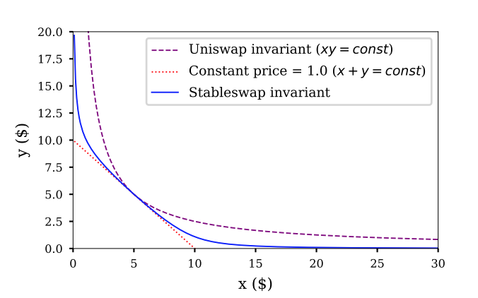 针对以上市场痛点,Curve 提出了一种创新的自动做市商( Automated Market-Makers,简称AMM )交易机制,专注于稳定币及其它挂钩资产的交易。协议创始人 Michael Egorov 于 2019 年 11 发布了 “StableSwap” 白皮书,产品 V1 版本在 2020年1月正式上线。Curve 采用了介于恒定总和(x+y=const) 和恒定乘积 (Uniswap xy=const) 函数之间的 AMM 交易机制,具体来说,该机制会在曲线的平衡点附近创建一条相对平坦的曲线,类似于恒定总和函数,以保持价格相对稳定,又使两端更多倾斜,类似于恒定乘积函数,这样在曲线的每个点都能够提供流动性。下图是该机制的示意图: