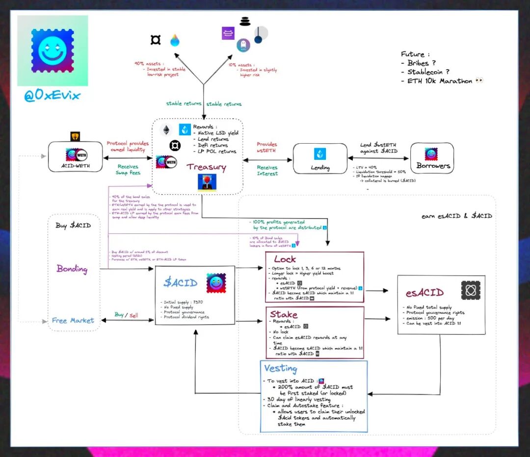 0xAcid 的机制相对复杂,概括来说就是锁定 ACID 可以累积更多的国库中的 ETH 索取份额 ,质押 ACID 可以获得更高的 LSD 资产产生的真实收益率。完整的机制如下图所示: