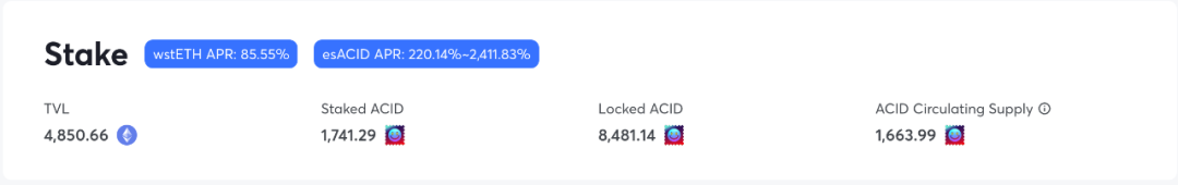 质押 ACID 为 Staked ACID 将获得两方面的收益:LSD 资产通过国库策略取得的全部收益以及Bonds 销售额的 10% 分红,两者都以 wETH 形式发放。目前 ACID 的质押 APR 约为 90%。质押中的 ACID 随时可以取消质押进入流通。
