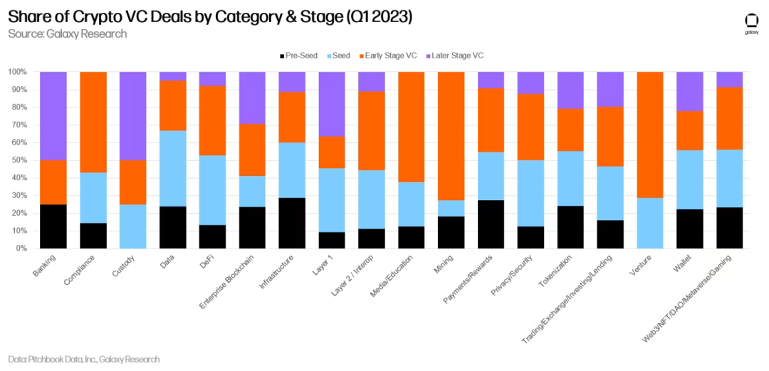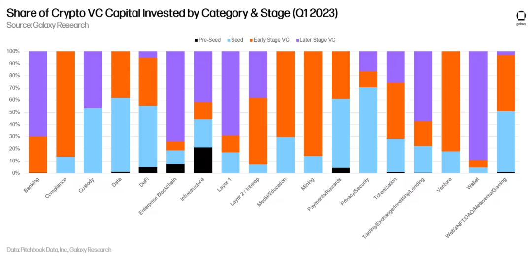 当在 2023 年第一季度按融资阶段评估时,VC 的活动看起来更加清晰(种子前、种子、早期、后期)。在后期阶段公司完成的融资中,“挖矿”类别占比最大,而包括节点托管和质押服务在内的“基础设施”类别在早期阶段公司完成的融资中占比最大。
